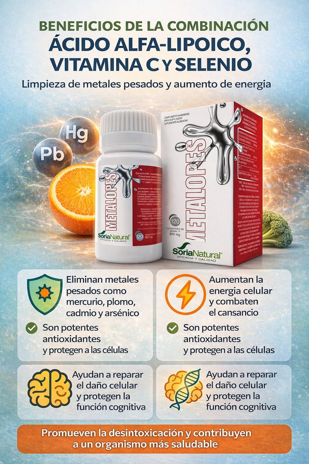 Afortunadamente, existen nutrientes con capacidad antioxidante y quelante que ayudan al organismo a defenderse. Entre ellos, destaca la combinación de Ácido Alfa-Lipoico (ALA), Vitamina C y Selenio, tres aliados clave para apoyar la eliminación de toxinas y recuperar energía.