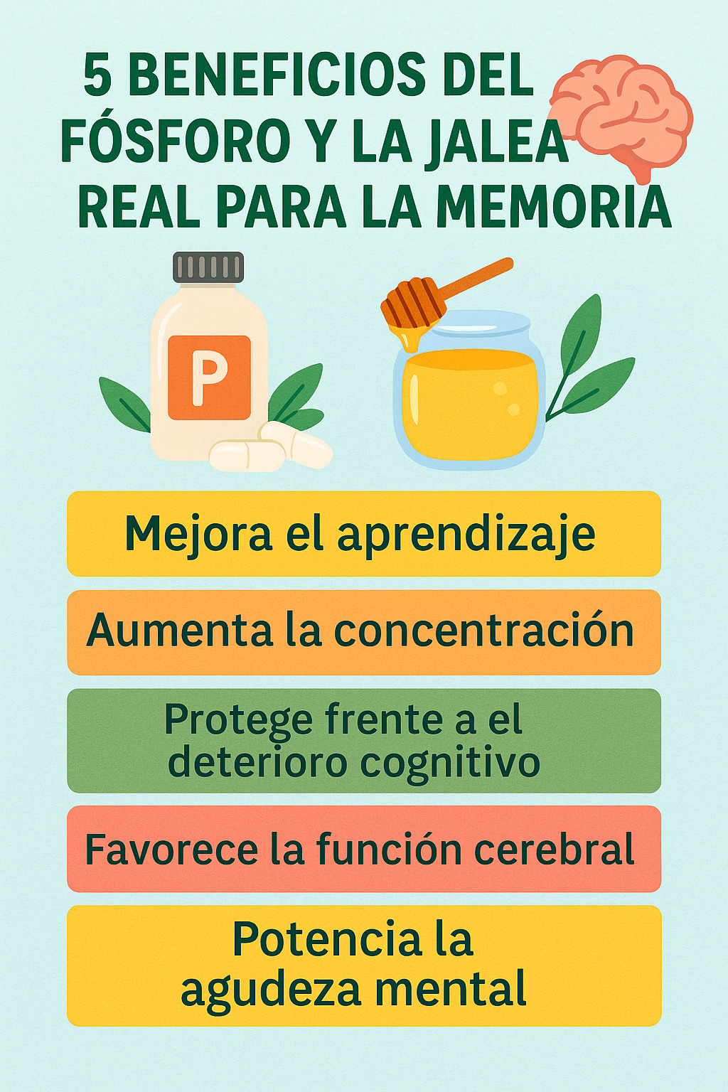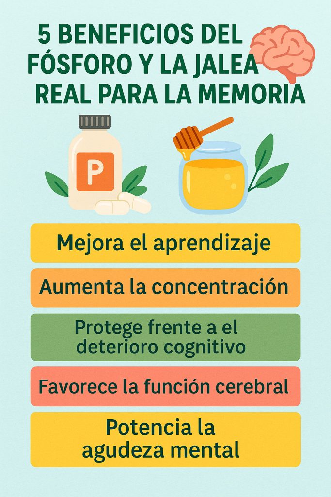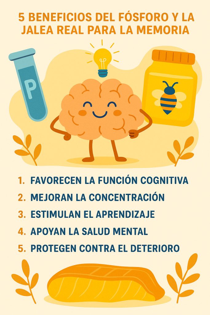 El fósforo contribuye a mantener una función cognitiva saludable, mientras que la jalea real ayuda a mantener la mente despierta gracias a su contenido en ácido pantoténico (vitamina B5), clave en el metabolismo energético cerebral.