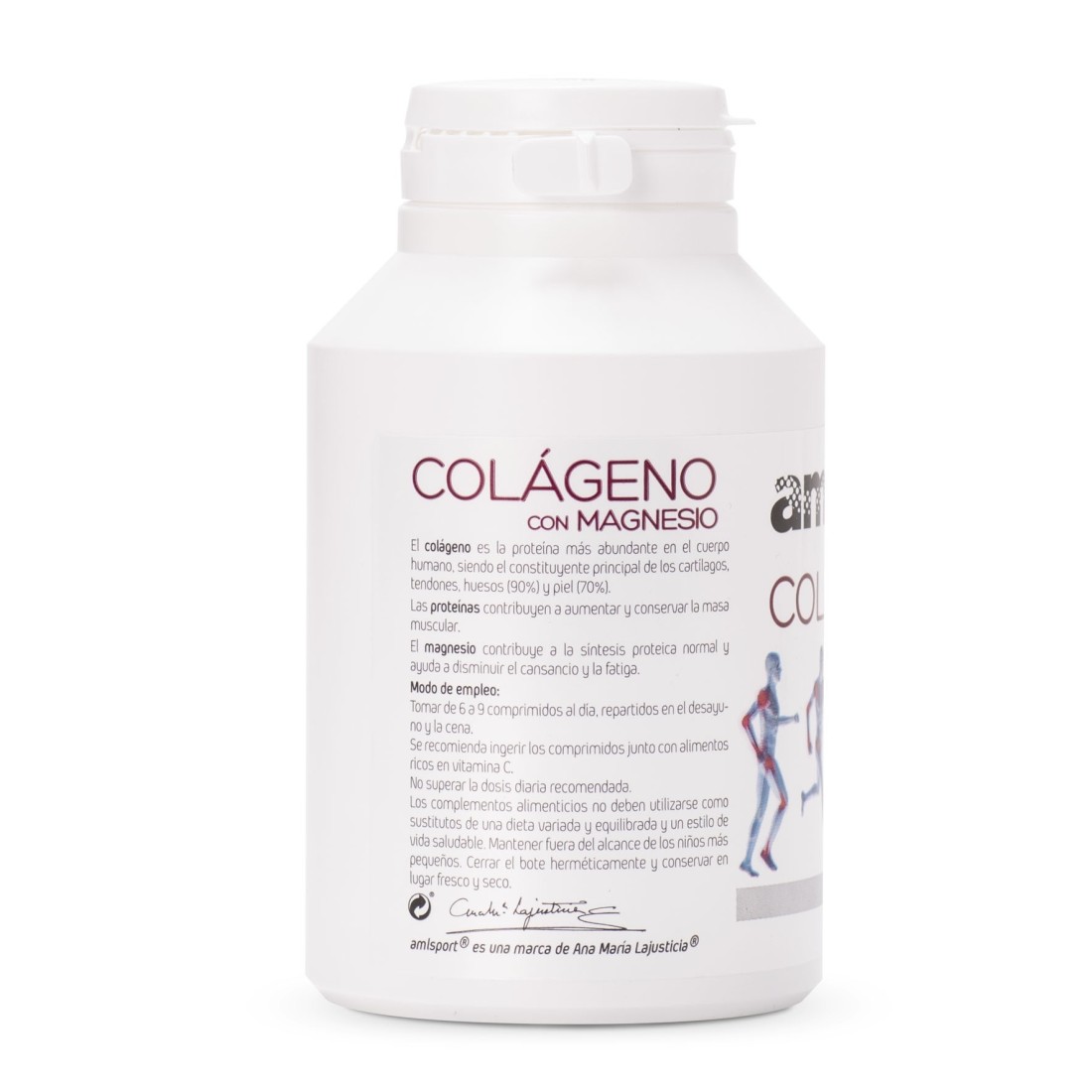 PROPIEDADES. AmlSport colágeno con Magnesio de Ana Maria Lajusticia es un complemento alimenticio que contribuye a regenerar los tejidos a base de colágeno hidrolizado de tipo I y II. Todo el tejido conectivo del cuerpo y articulaciones está formado por colágeno, por lo que su aporte nos ayuda a regenerar su desgaste y envejecimiento, y a mantener en buen estado nuestras articulaciones, huesos, piel y a estar en forma. A este compuesto le hemos añadido Magnesio que es un elemento que participa muy activamente en la formación de todas las proteínas del organismo. Así mismo, su aporte adicional contribuye al funcionamiento normal de los músculos. La piel requiere colágeno para su mantenimiento y para retrasar la aparición de arrugas. El cabello necesita, para estar saludable, unos buenos aportes de colágeno. Las uñas para estar fuertes y sanas necesitan poder disponer de colágeno.