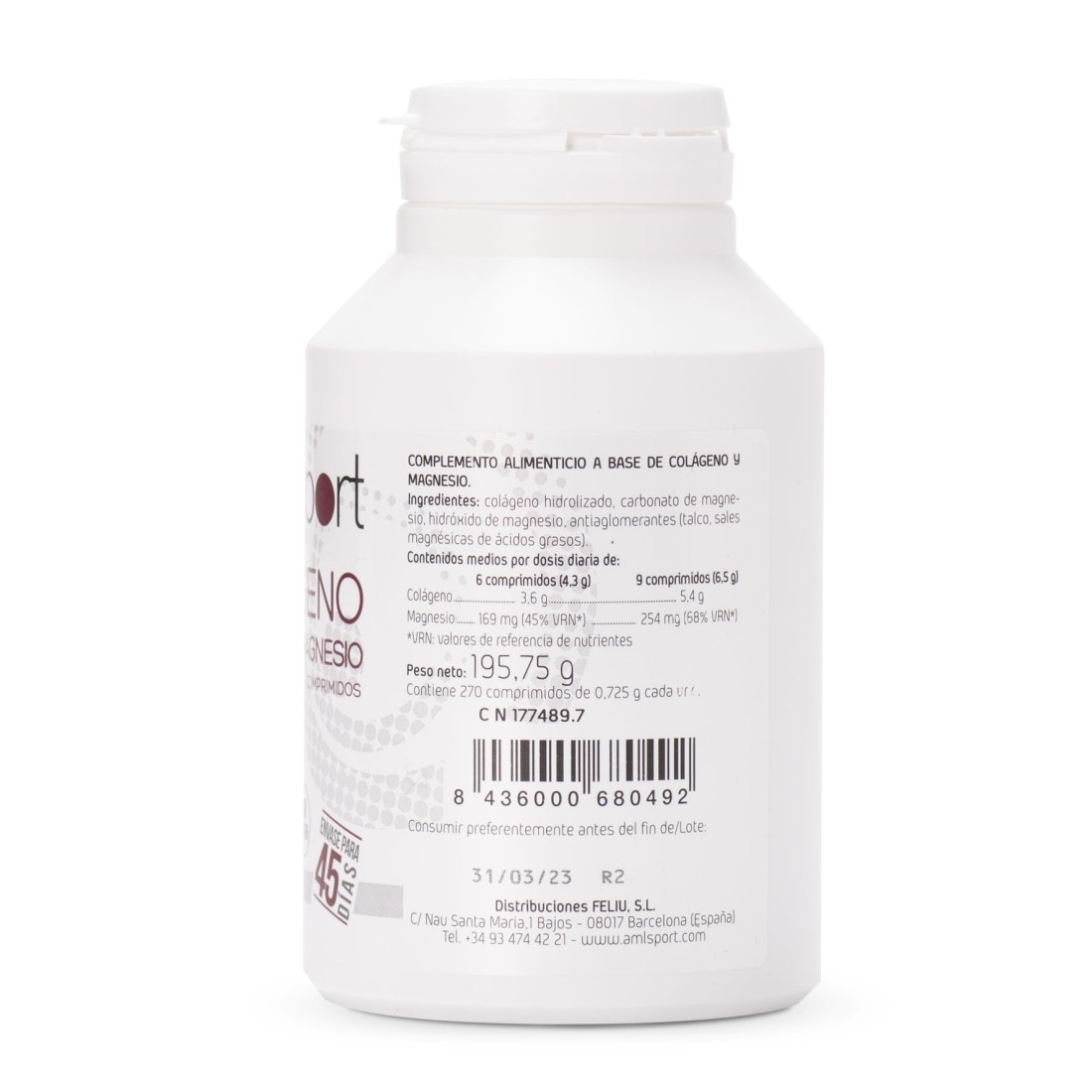 COLAGENO CON MAGNESIO 270 comp. AMLSPORT. Las combinaciones de Colágeno con Magnesio y vitaminas C y B son los aliados ideales para garantizar un buen rendimiento deportivo. El colágeno es el componente principal nuestras articulaciones, tendones, ligamentos, músculos y huesos. El magnesio y la vitamina C potencian la síntesis de proteínas y la formación de nuevo colágeno. La toma diaria de suplementos de colágeno con magnesio de amlsport® garantiza un correcto equilibrio proteico, mineral y vitamínico para fortalecer las articulaciones, huesos y músculos de los deportistas y mejorar su recuperación post-entreno.