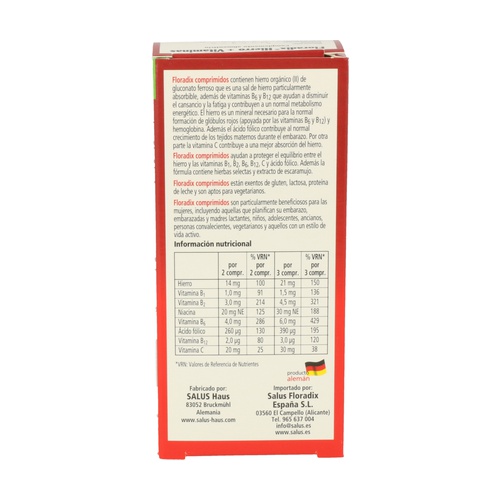 FLORADIX HIERRO VITAMINAS 84 comp. SALUS. Adecuado para mujeres, especialmente durante el embarazo y la lactancia, adolescentes, ancianos, convalecientes y para personas con un estilo de vida activo. Contiene hierro orgánico de gluconato ferroso, vitaminas B1, B2, B6, B12, C, niacina y ácido fólico. El hierro, las vitaminas B2, B6, B12, C y la niacina contribuyen a disminuir el cansancio y la fatiga y con la vitamina B1 al metabolismo energético normal. Además, el hierro contribuye a la formación normal de glóbulos rojos y de hemoglobina. La vitamina C aumenta la absorción del hierro.