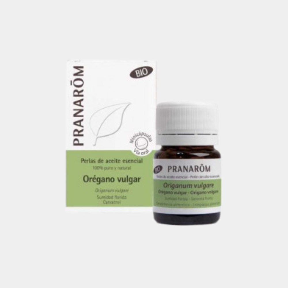 OREGANO PERLAS BIO 60 cap. PRANAROM. Aceite esencial 100% puro y natural de Orégano vulgar. Cuenta con compuestos como el carvacrol y el timol, que tienen propiedades antibacterianas y antimicrobianas. Además, también presenta propiedades antifúngicas, antiinflamatorias y estimulantes del sistema inmune. Obtén grandes beneficios para la salud del sistema inmunológico y respiratorio