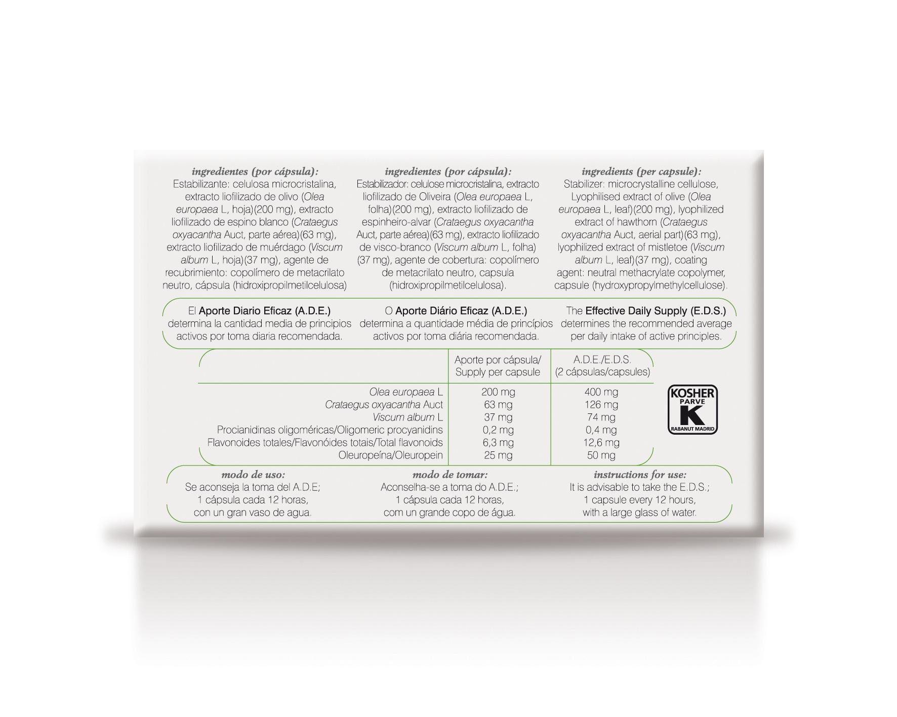 INGREDIENTES POR CAPSULA: celulosa microcristalina, extracto liofilizado de olivo (Olea europaea L, hoja) (200 mg), extracto liofilizado de espino blanco (Crataegus oxyacantha Auct, parte aérea) (63 mg), extracto liofilizado de muérdago (Viscum album L, hoja) (37 mg), agente de recubrimiento: copolímero de metacrilato neutro, cápsula (hidroxipropilmetilcelulosa).