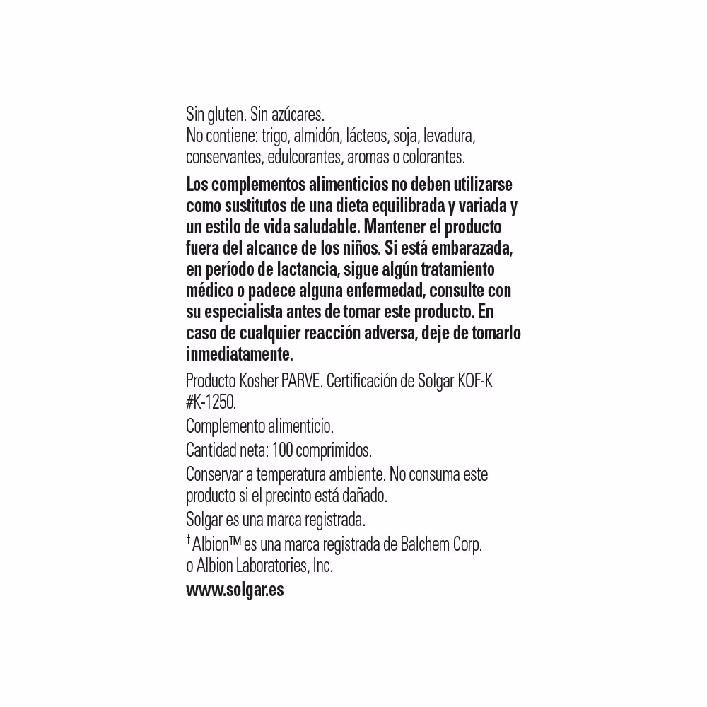 ZINC QUELADO 100 comp. SOLGAR. Aporta zinc de alta calidad en una forma de fácil absorción. Mediante un proceso de quelación el mineral queda “envuelto” con dos moléculas del aminoácido glicina, lo que permite una absorción mejorada a través de la vía de absorción de aminoácidos. El zinc es un nutriente necesario para muchas funciones del organismo. Contribuye al funcionamiento del sistema inmunitario, al mantenimiento de la piel, cabello y uñas, a la protección de las células del daño oxidativo, y contribuye a la fertilidad masculina y femenina.